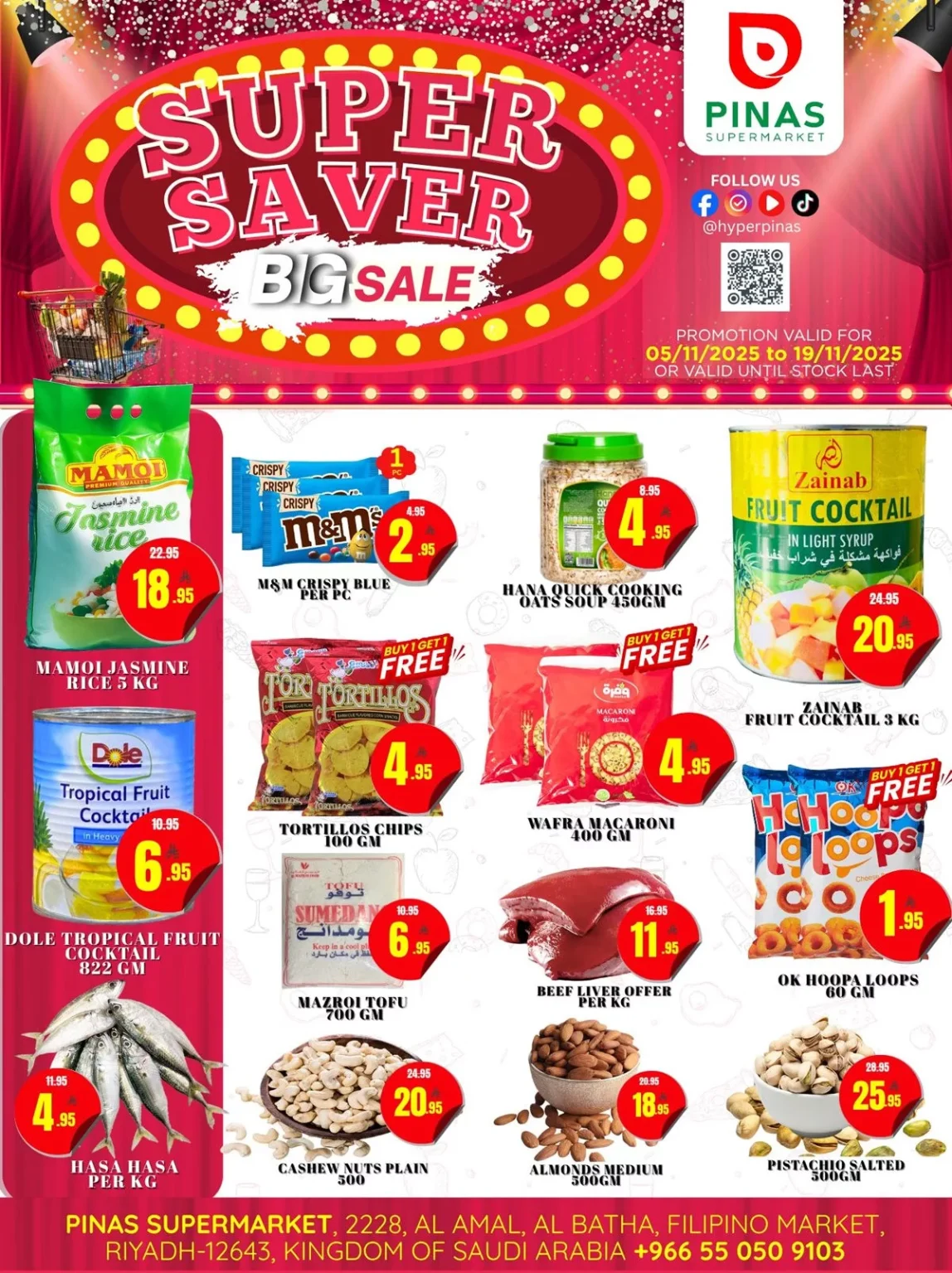 عروض بيناس هايبر ماركت الرياض الخميس 13/11/2025 تحتوي تخفيضات ضخمة على الأجهزة المنزلية مثل أفران الطبخ وأجهزة العجن واجهزة إعداد الحلويات وأجهزة الطبخ الهوائية كما تقدم منتجات غذائية مثل الأرز والحبوب والفواكه والعسل الطبيعي والزيوت والمكسرات والبهارات ومنتجات الإفطار وباقل الاسعار المناسبة للكل .