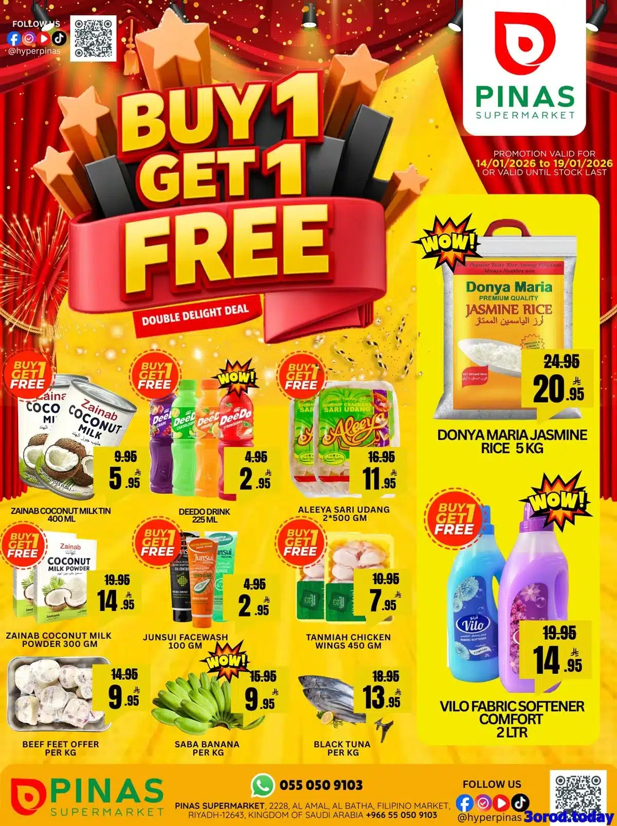عروض بيناس الرياض الأربعاء 14-1-2026 الموافق 25 رجب 1447هـ تقدم منتجات غذائية مثل الخبز وعسل السدر واللحم المحلي والفاكهة الموسمية والأجبان واللبن والسمن والبهارات والقهوة والتمور والخضروات وتكتمل العروض بأجهزة تشمل دفاية كهربائية وعصارة حمضيات وخلاط يدوي وشواية فحم متنقلة ومكواة بخار عمودية وفرن كهربائي