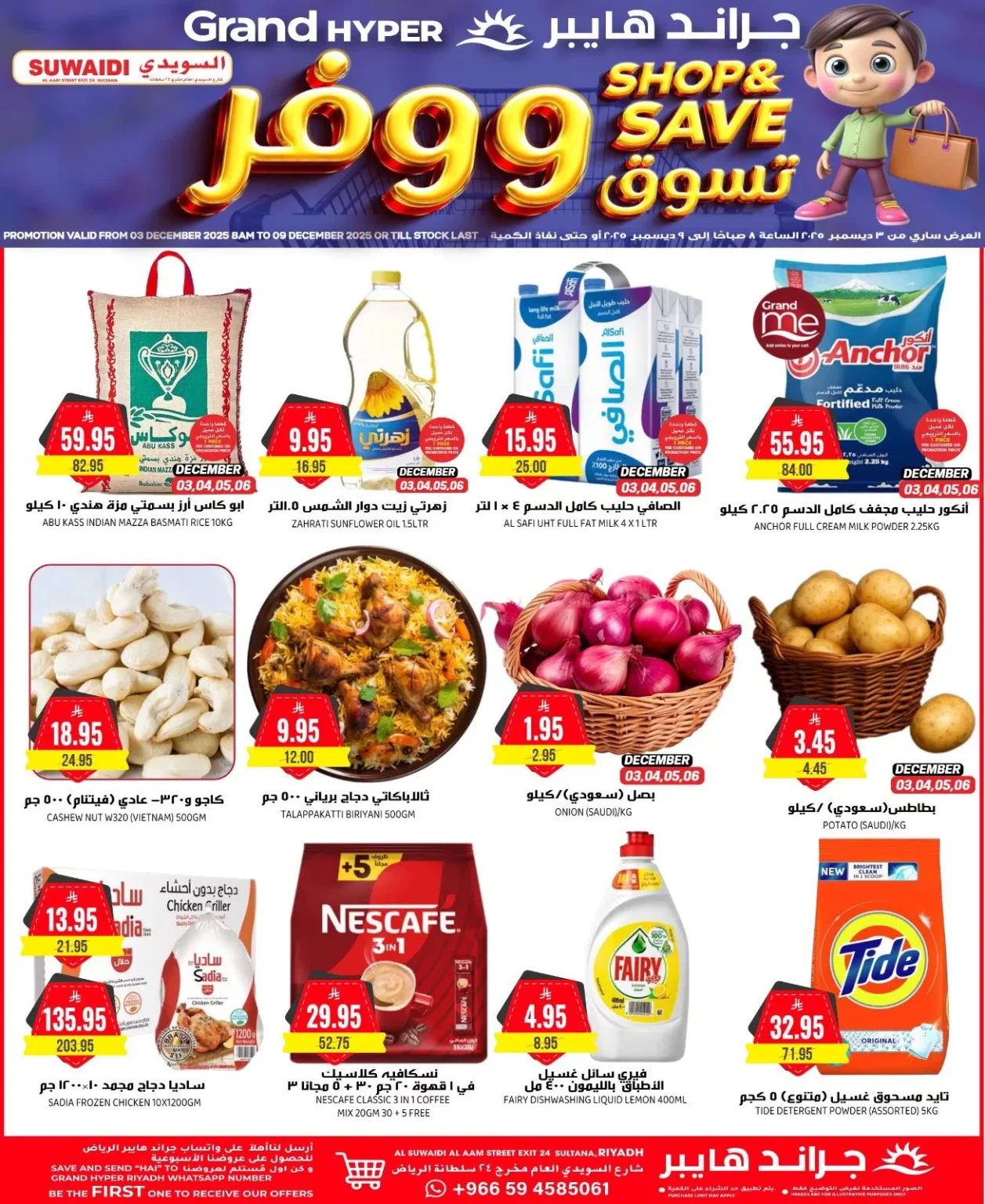 عروض جراند هايبر الرياض الأربعاء 3 ديسمبر 2025 تضم مجموعة غذائية تشمل البطاطس الكبيرة والطماطم الدائرية والخيار الطويل والبرتقال الحلو والعنب الأحمر مع الجبن القريش وشرائح الدجاج المقلية والفطائر الدافئة ثم تشمل الأجهزة المنزلية صانع كريب كهربائي وغلاية ماء شفافة مع وجود تغطية حصرية ايا لـ عروض العثيم فقط ابقوا معنا ليصلكم كل جديد .