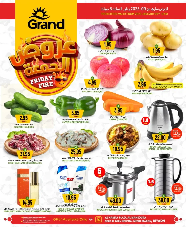 تحتوي عروض جراند هايبر الرياض علي : بصل – بطاطس – تفاح فوجي – موز – خيار – فلفل أخضر – جزر – غلاية ستيل ايمبكس – لحم حاشي طازج بالعظم – قريدس مزرعة – برياني لحم بقري – كولونيا جوفان وايت مسك – شامبو هيد اند شولدرز – قدر ضغط ايمبكس – ترمس بازيوت – حليب طازج