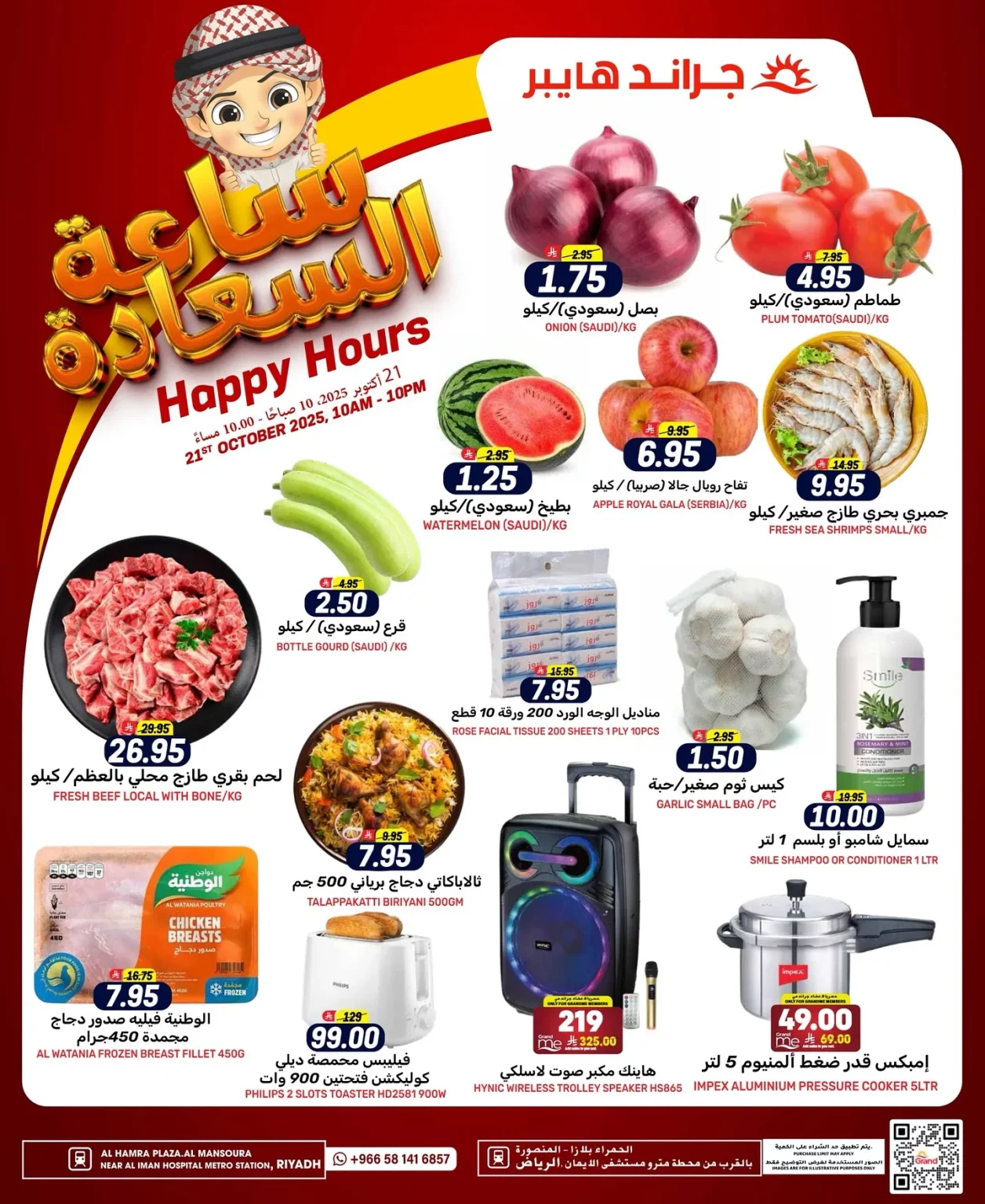 عروض جراند هايبر الرياض الثلاثاء 21-10-2025 تتألق بتشكيلة واسعة من المنتجات الطازجة حيث تتوفر خضروات مثل البصل والطماطم والبطيخ السعودي بالإضافة إلى الباذنجان والفواكه مثل التفاح و بتوفر كمان مناديل الوجه الورقية والثوم الطازج ومنتجات العناية مثل الشامبو والبلسم وأجهزة منزلية باقل الاسعار المناسبة للجميع .