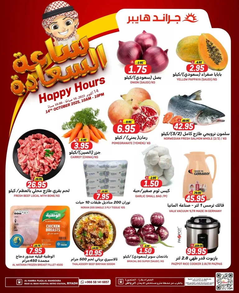 عروض جراند هايبر الرياض الثلاثاء 14 اكتوبر 2025 تقدم منتجات طازجة كتير خاصة بالخضروات والفواكه الطازجة منها البصل السعودي والجزر الصيني والرمان اليمني بالإضافة إلى البابايا الصفراء الطازجة وتوفر كمان منتجات مميزة مثل الثوم المحلي وقائمة مختارة من اللحوم الطازجة والدجاج المجمد الفاخر بارخص الاسعار المناسبة للجميع