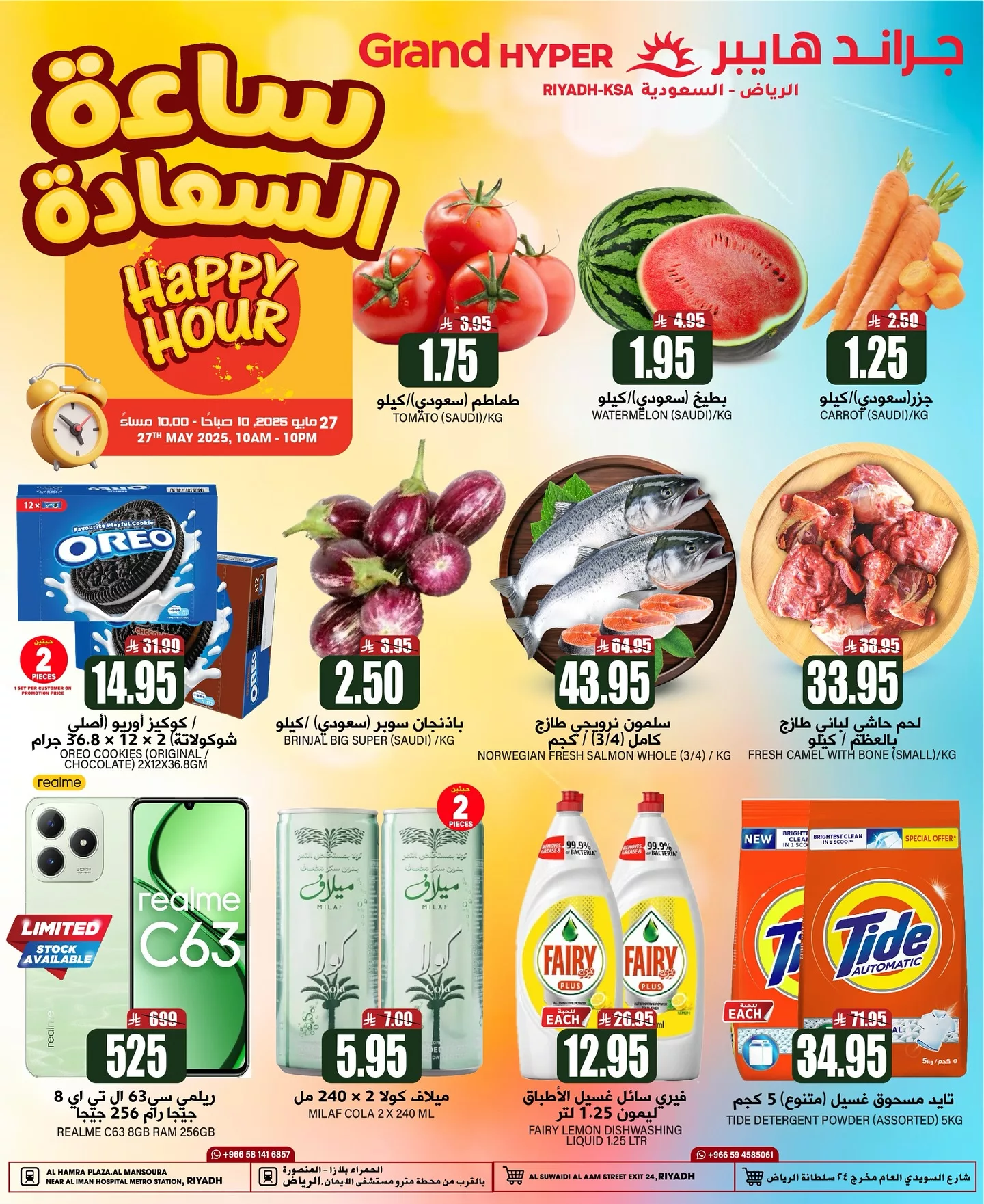 عروض جراند هايبر الرياض يوم الثلاثاء 27 مايو 2025 موجة من التخفيضات الاستثنائية ضمن حملة ساعة السعادة التي تبدأ من العاشرة صباحًا وحتى العاشرة مساءً وتضم مجموعة مختارة من الخضار والفواكه الطازجة مثل الطماطم والبطيخ والجزر والباذنجان بجودة محلية ممتازة تم اختيارها بعناية لتلبية احتياجات الأسرة السعودية