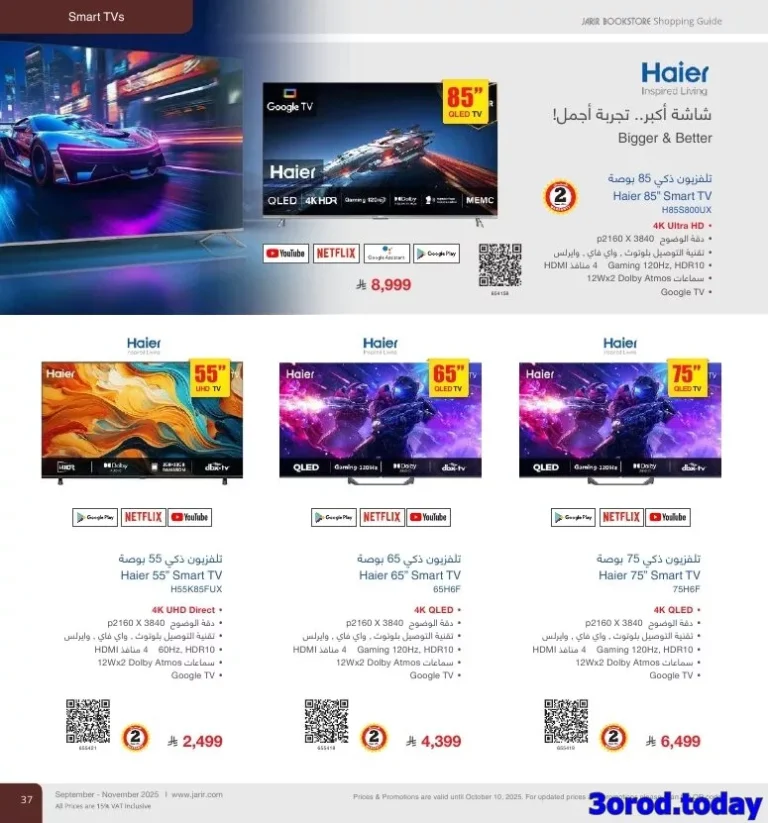 نقدم لكم احدث عروض جرير علي التلفزيونات الذكية و ذلك خلال شهر نوفمبر 2025 و تشمل علي الشاشات الذكية من اهم و اشهر العلامات التجارية العالمية و تتميز بدقة عرض عالية وأحجام متنوعة تناسب جميع المساحات بالإضافة إلى التصميمات و قوة الاداء تابعونا علي موقعكم عروض توداي ليصلكم كل جديد عن عروض السعودية .