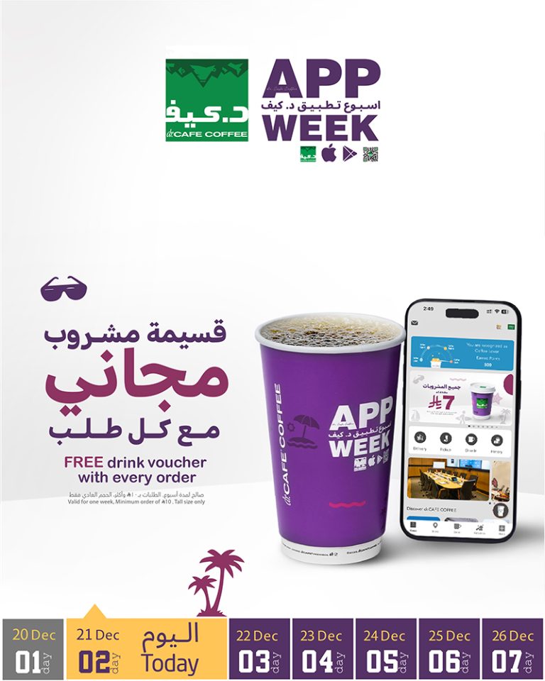 شاركها فيسبوك تويتر لينكدإن بينتيريست البريد الإلكتروني عروض د.كيف كافيه اليوم احصل على قسيمة مشروب مجاني مع كل طلب بقيمة 10 ريال فأكثر العرض متاح اليوم فقط الاحد 21-12-2025