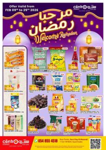 عروض سنترو الرياض اليوم الاحد 9 فبراير 2026 الموافق 21-8-1447 و تحتوي علي توفر جميع التجهيزات الرمضانية من أجود أنواع التمور كالمجدول والصقعي مع تشكيلة متنوعة من الأرز البسمتي وزيوت الطبخ