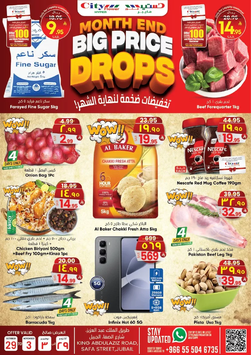 عروض سيتي فلور الجبيل الأسبوعية الأربعاء 7 جماد الاول 1447هـ تحتوي على تشكيلة من الأغذية الطازجة والمخبوزات والحلويات والعصائر والفواكه الموسمية والعسل الطبيعي والمشروبات الغازية والقهوة والشاي والصلصات المتنوعة بالإضافة إلى خصومات على الأجهزة الصغيرة مثل أجهزة القهوة وأفران الكريب