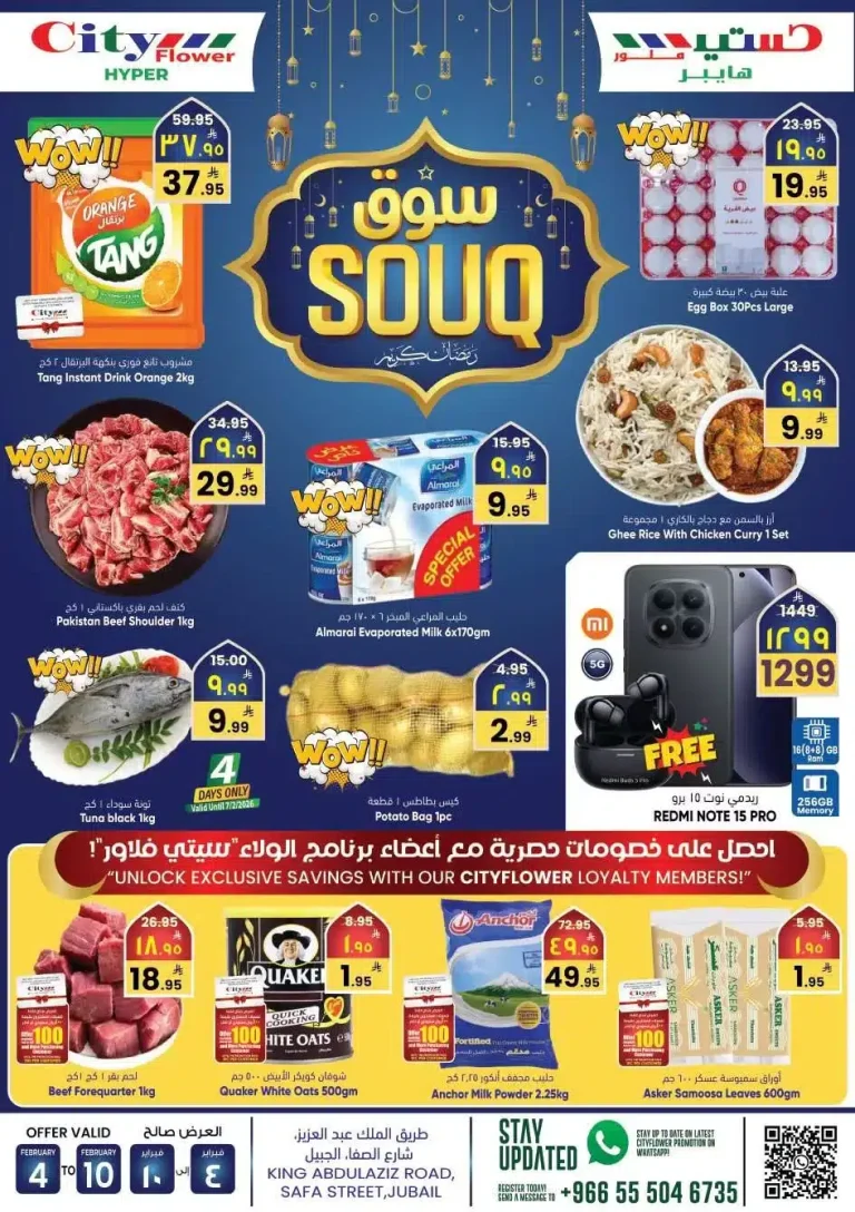 عروض سيتي فلور الجبيل الأربعاء 4 فبراير 2026 الموافق 16 شعبان 1447هـ و تتضمن التمور مياه معدنية حليب بودرة أرز البهارات لحم مبرد دجاج زيت وسكر وشاي مكرونة عدس خضروات طازجة وفاكهة وصلصات وزبادي وأجبان ولحوم وتحتوي الأجهزة على قدر ضغط فرن كهربائي سخان مياه محضر طعام مكينة وافل مفرمة لحم قلاية بدون زيت ميكروويف وصانعة قهوة ومبرد مياه