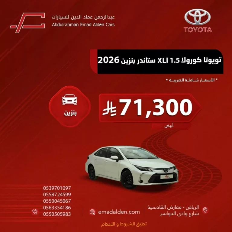 تطلق عروض عبدالرحمن عماد الدين للسيارات برنامج عروض استثنائي على سيارة تويوتا كورولا 1.5 XLI ستاندر بنزين موديل 2026، وذلك بمناسبة حلول شهر رمضان المبارك