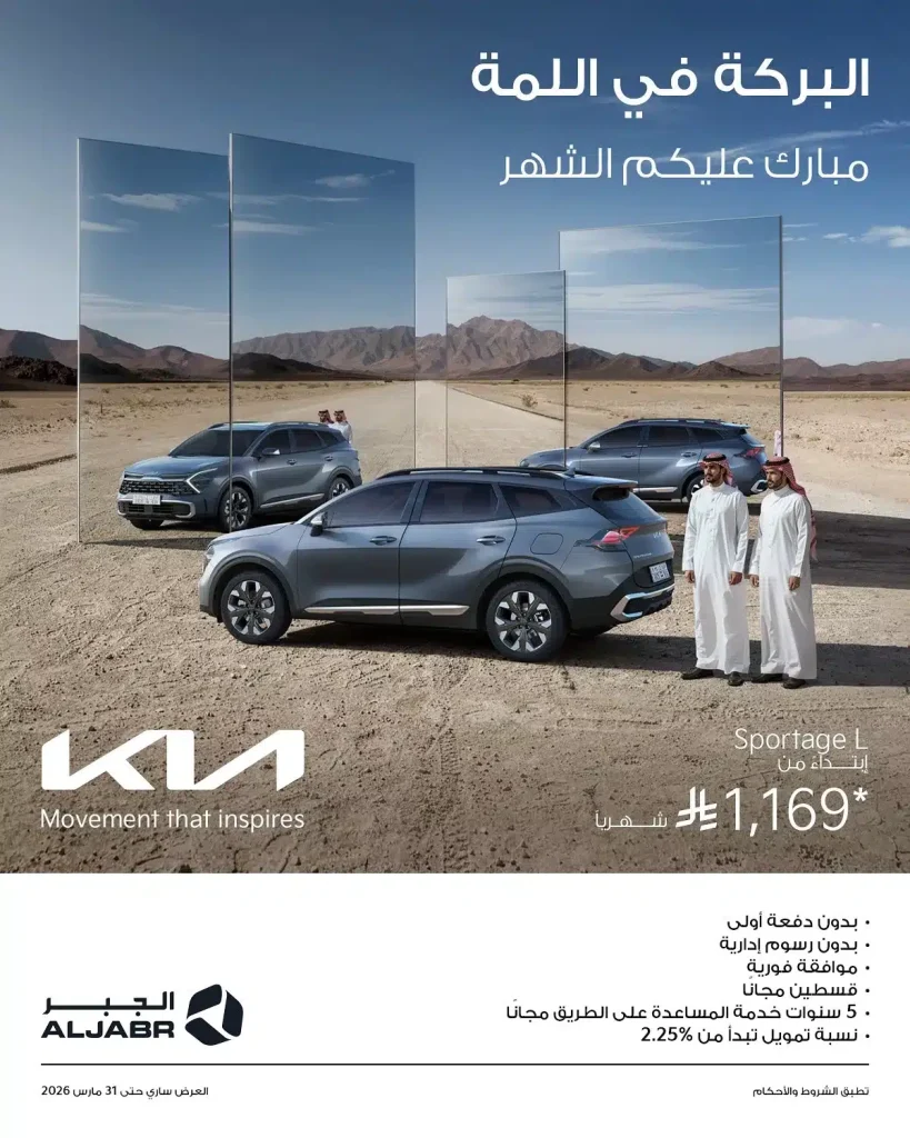 عروض كيا الجبر على كيا سبورتاج ابتداءً من 1,169 ريال شهرياً افضل العروض المميزه لشهر رمضان المبارك في معارض كيا الجبر العرض ساري حتى 31 مارس 2026 فقط لا تفوتوا اقوى العروض بدون دفعة أولى و قسطين مجاناً مع 5 سنوات خدمة المساعدة على الطريق استفيدوا من العرض