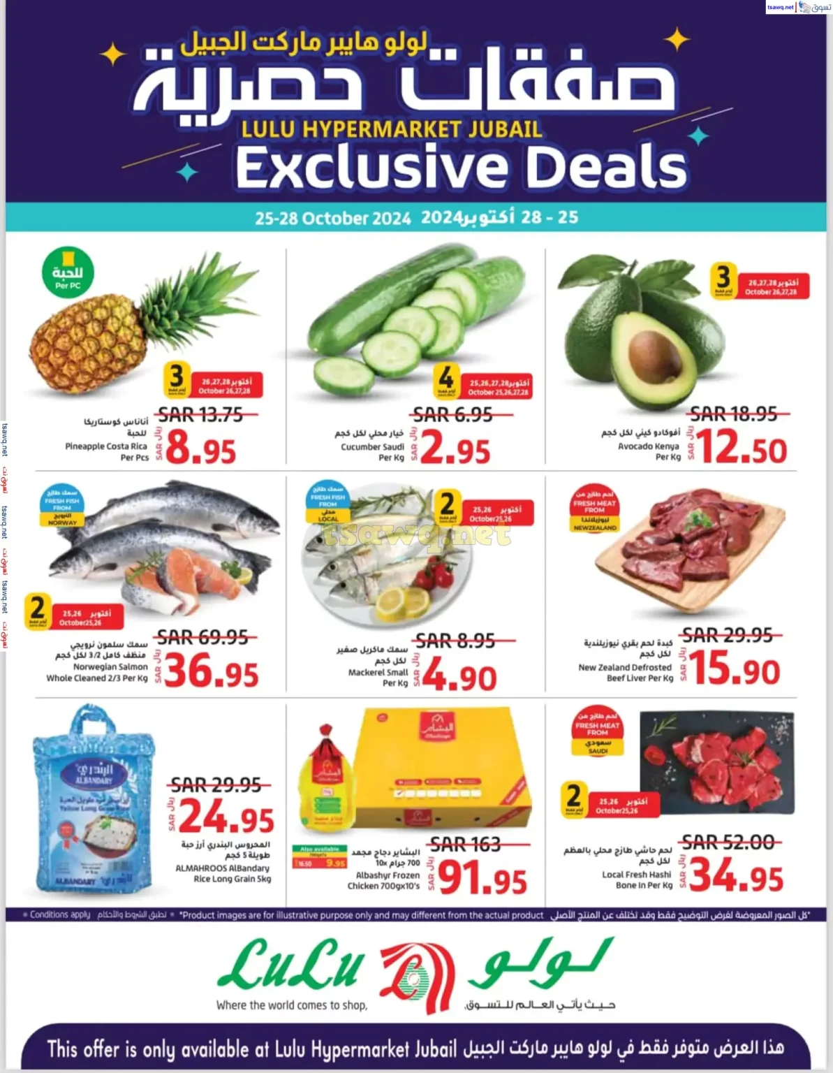 تقدم عروض لولو الجبيل الاحد 27-10-2024 مجموعة من التخفيضات المميزة على المنتجات الطازجة مثل الفواكه والخضروات مما يجعل التسوق لاحتياجات الأسرة من المواد الغذائية الأساسية متاحا بأسعار منافسة و يمكن للمتسوقين الاستفادة من أسعار مخفضة على خيارات متنوعة تشمل الخيار والأفوكادو والأناناس،