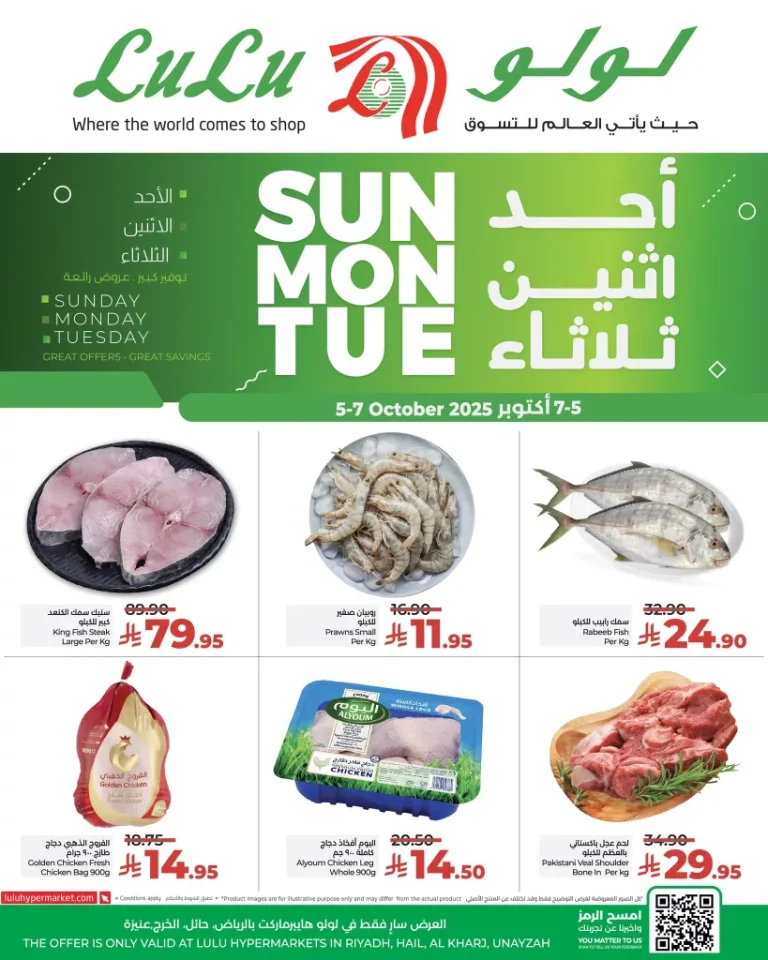 عروض لولو الرياض الأحد 5-10-2025 تقدم مجموعة متنوعة من منتجات اللحوم الطازجة والدواجن والأسماك منها قطع اللحوم الطازجة من العجل الهندي والبقر الجاموسي بالإضافة إلى الكبد البقري ولحم الضأن التنزاني وعروض خاصة على الدجاج المحلي الطازج وأصناف متنوعة من الأسماك و توفر أيضا تشكيلة من الخضروات و الفواكه