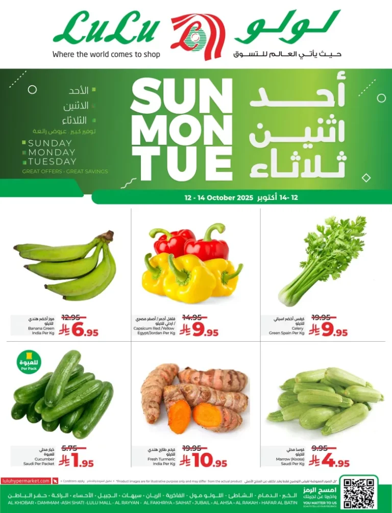 عروض لولو المنطقة الشرقية الأحد 12 أكتوبر 2025 تقدم تشكيلات متنوعة من الخضار الطازجة والفواكه المستوردة والمنتجات عالية الجودة حيث تشمل الخيارات المتاحة الموز الأخضر والفلفل الأحمر والأصفر والكرفس والخيار والكركم الطازج والكوسا الناضجة بالإضافة الي اللحوم الطازجة والأسماك والمأكولات البحرية من مصادر متعددة