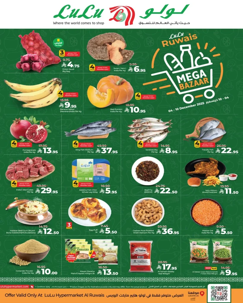 عروض لولو جدة الاسبوعية الخميس 4 ديسمبر 2025 و بتحتوي علي تشكيلة من الخضروات والفواكه مثل البصل والبطاطا واليقطين والموز والرمان إضافة إلى تشكيلة واسعة من الأسماك الطازجة واللحوم الحمراء والبهارات و العديد من منتجات البقالة الأساسية وغيرها من المنتجات باقل الاسعار المناسبة للجميع .