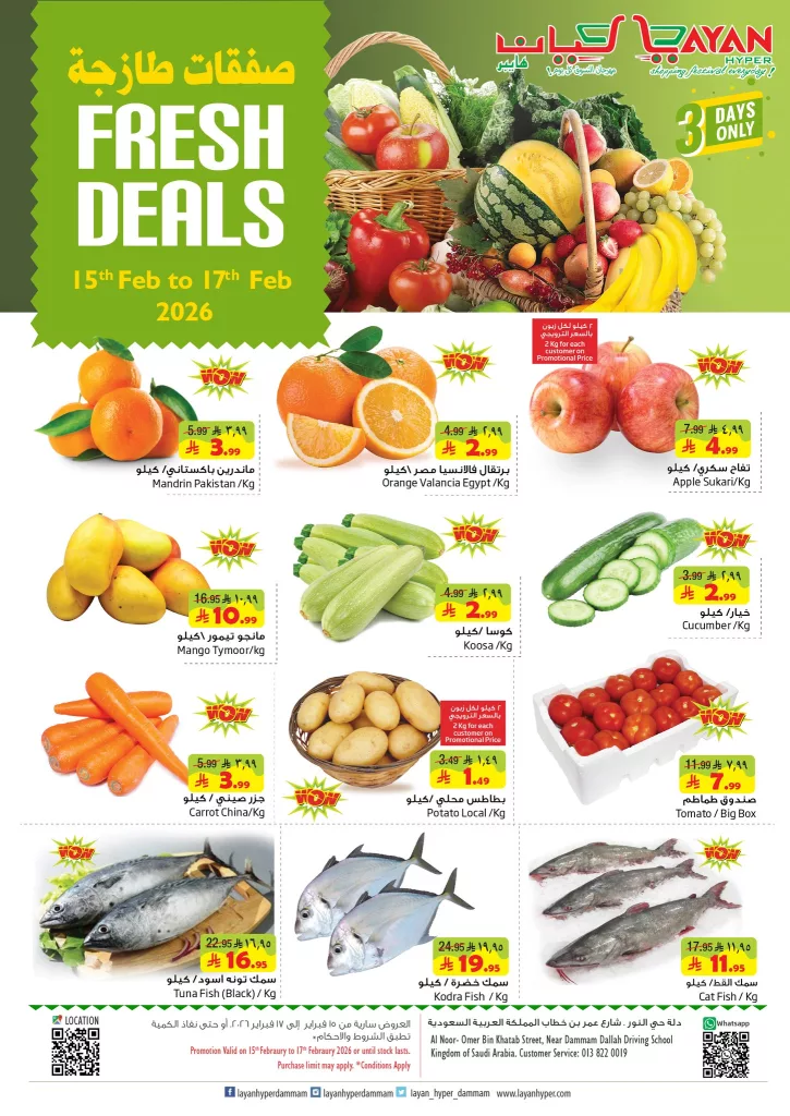 عروض ليان هايبر ماركت الاحد 15 فبراير 2026 و تحتوي علي تشكيلة متنوعة من الفواكه والخضروات تشمل الماندرين والبرتقال والتفاح والمانجو والكوسا والخيار والجزر والبطاطس والطماطم بالإضافة إلى الأسماك كالتونة والكودرا وسمك القط بفرع الدمام باسعار مميزة لفترة محدودة ابقوا معنا ليصلكم كل جديد