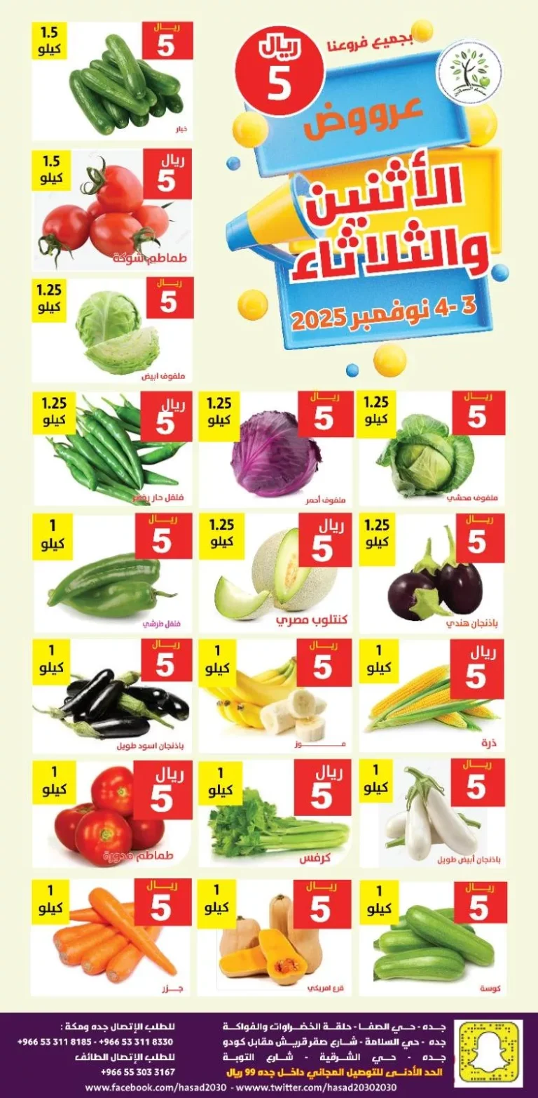 عروض حصاد البساتين الاثنين 3 نوفمبر 2025 تقدم مجموعة من الخضروات الطازجة مثل البطاطس والبصل الأبيض والباذنجان الرومي والجرجير والسبانخ و توفر كمان تشكيلة كبيرة من الفواكه مثل البرتقال أبو صرة والأناناس والجوافة والفواكه الموسمية مثل العنب الأسود والأبيض وغيرها من المنتجات و باقل الاسعار فقط تابعونا ليصلكم كل جديد
