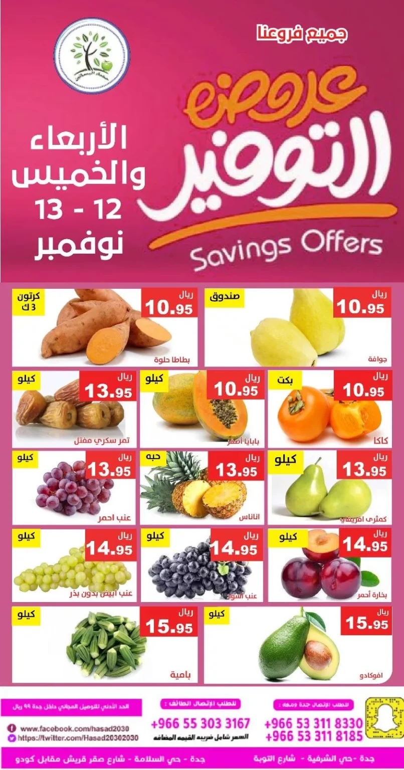 نقدم لكم اليوم احدث عروض مؤسسة حصاد البساتين الطازج الاربعاء 12 نوفمبر 2025 و بتحتوي علي تشكيلة من الفواكه والخضروات المنوعة من التفاح الأخضر والتفاح الأحمر إلى الفراولة والموز والبرتقال والكوسة والباذنجان والبطاطس والقرع بأنواعه بالإضافة إلى أنواع متعددة من الطماطم مثل الطماطم الشوكة والمدورة والخس