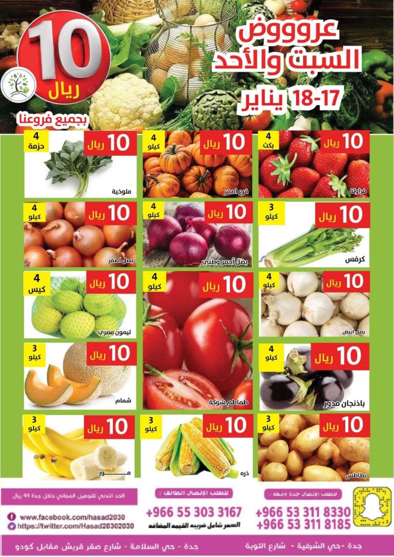 عروض مؤسة حصاد البساتين بتقدم ليكم السبت 17 يناير 2026 الموافق 28 رجب 1447هـ تشكيلة من الخضروات الطازجة منها البطاطس و الطماطم و الباذنجان و الفلفل و ايضا فواكه شهية منها الموز و الفراولة و الاناناس و التفاح و غيرها من المنتجات في صفقات حصرية باقل الاسعار متاحة لمدة يومان
