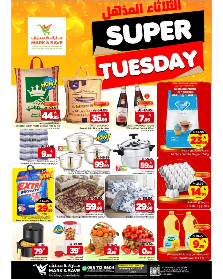 عروض مارك اند سيف الاحساء الثلاثاء 10-2-2026 الموافق 22 شعبان 1447 و تحتوي علي الأرز والسكر والزيت والبيض والفاكهة والخضروات الطازجة بالإضافة إلى المنظفات والمناديل الورقية