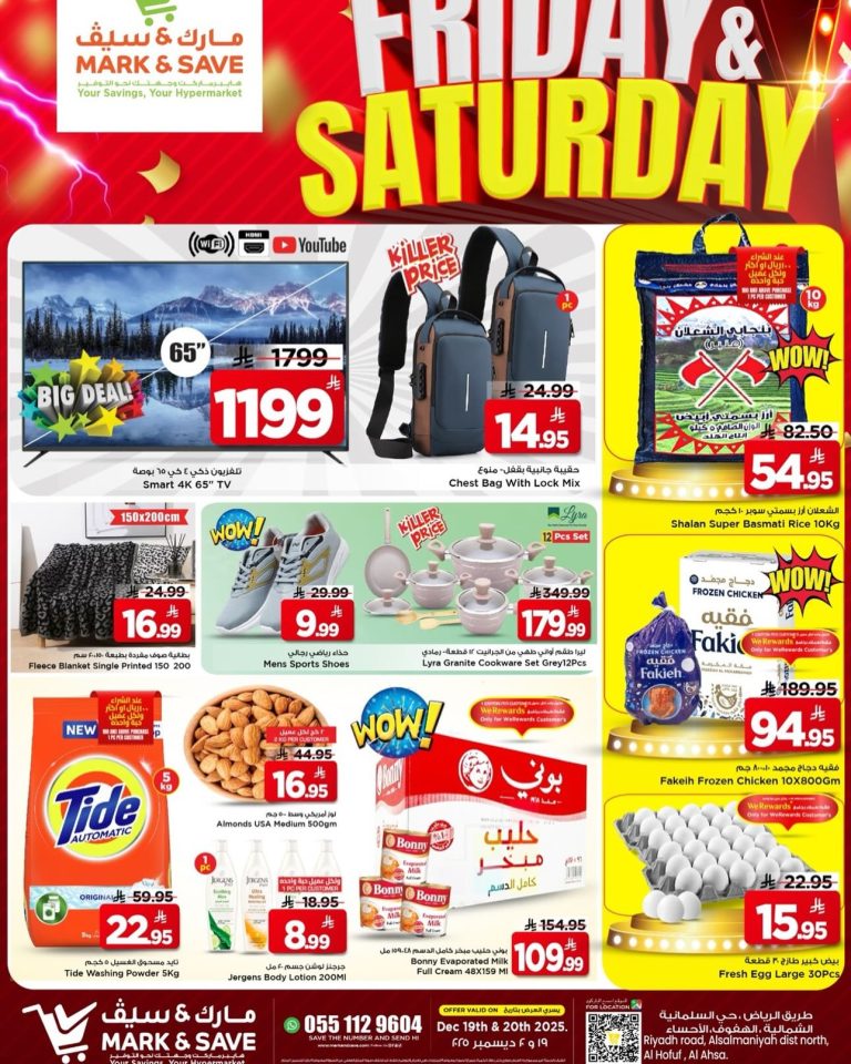 نقدم لكم اليوم عروض مارك اند سيف الاحساء السبت 20 ديسمبر 2025 تشمل الأجهزة المنزلية والالكترونيات والمنتجات المنزلية بجانب حقائب الظهر والكتف العملية  إضافة إلى الأرز البسمتي  مع الأحذية الرياضية والأواني المنزلية و بارخص الاسعار المناسبة للجميع اليوم فقط لا تفوت الفرصة ووفر الان .