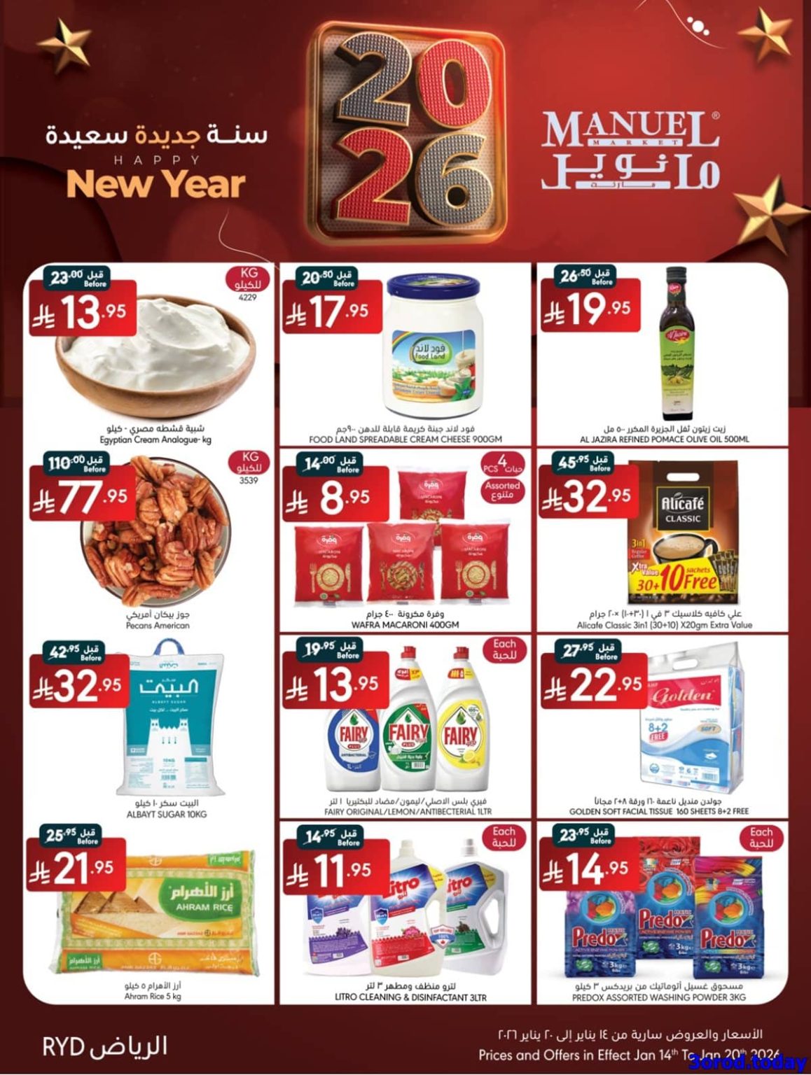 عروض مانويل الرياض الخميس 26 رجب 1447هـ الموافق 15-1-2026 تقدم منتجات غذائية منها جبنة شيدر ولحم عضوي ومخبوزات فرنسية وزيت جوز وحلويات مستوردة وشوكولاتة وقهوة مختصة وزيت زيتون وأرز فاخر وتكتمل العروض بأجهزة تشمل صانعة قهوة وفرن بيتزا وخلاط ومكواة بخار وشاشة ذكية وقلاية هوائية ومحضرة طعام