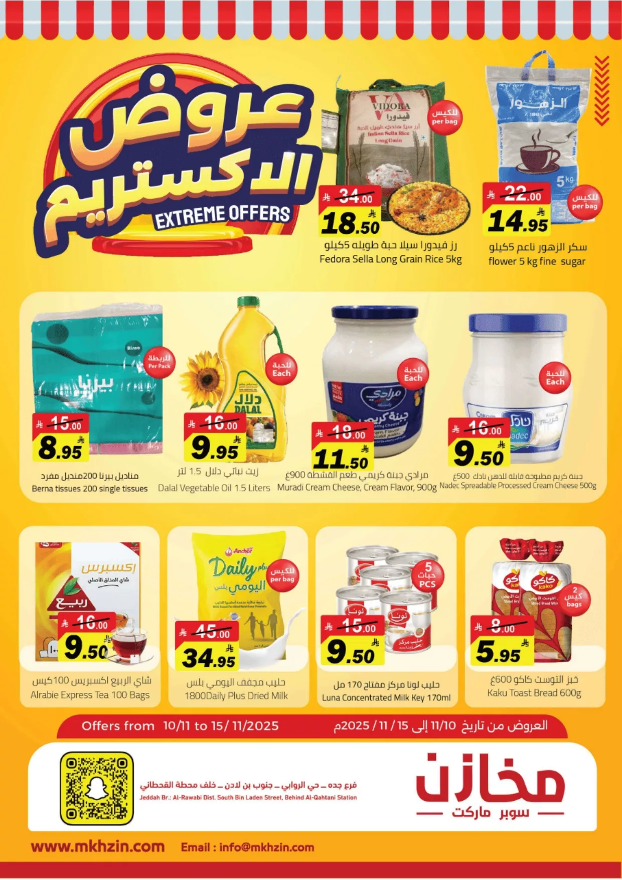نتابع معكم عروض مخازن سوبر ماركت و تستمر حتي السبت 24 جماد الاول 1447هـ و بتحتوي علي أصناف الأرز والدقيق والسكر بأنواعها المختلفة إضافة إلى المكرونة وزيوت الطبخ المتنوعة مثل زيت الذرة وزيت دوار الشمس وزيت الزيتون كما تتواجد القشطة والكريمة والمعلبات والحليب المجفف والسائل باسعار منافسة .
