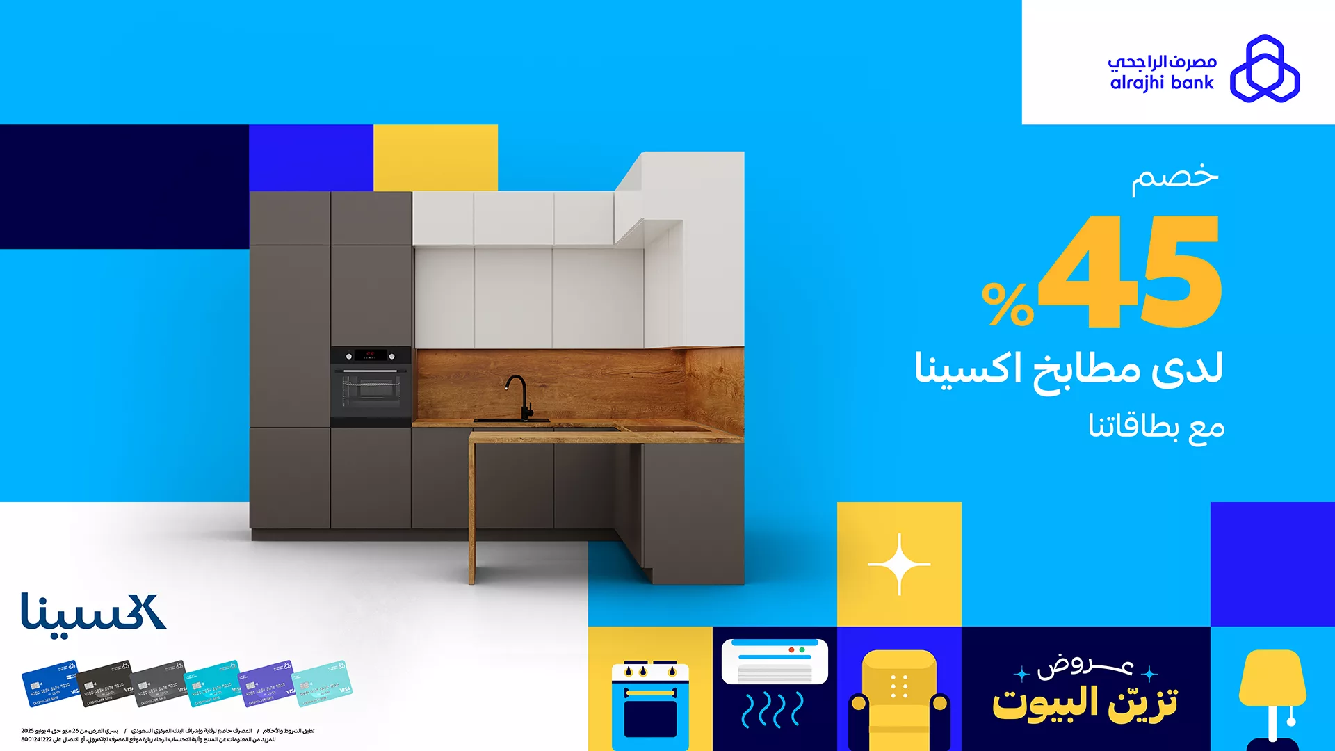 إذا كنت من حاملي بطاقات مصرف الراجحي، فبإمكانك الاستفادة من هذا الخصم الكبير عند زيارتك لأحد فروع مطابخ اكسينا. العرض يندرج ضمن حملة “تزيّن البيوت” التي تهدف إلى تقديم حلول ذكية واقتصادية لتجديد المنازل السعودية بأعلى جودة