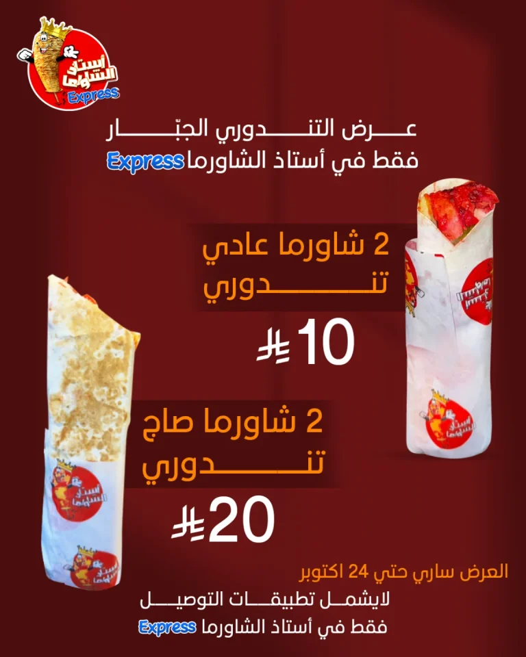 عروض مطعم أستاذ الشاورما على التندوري الجبار حتى 24 اكتوبر 2025