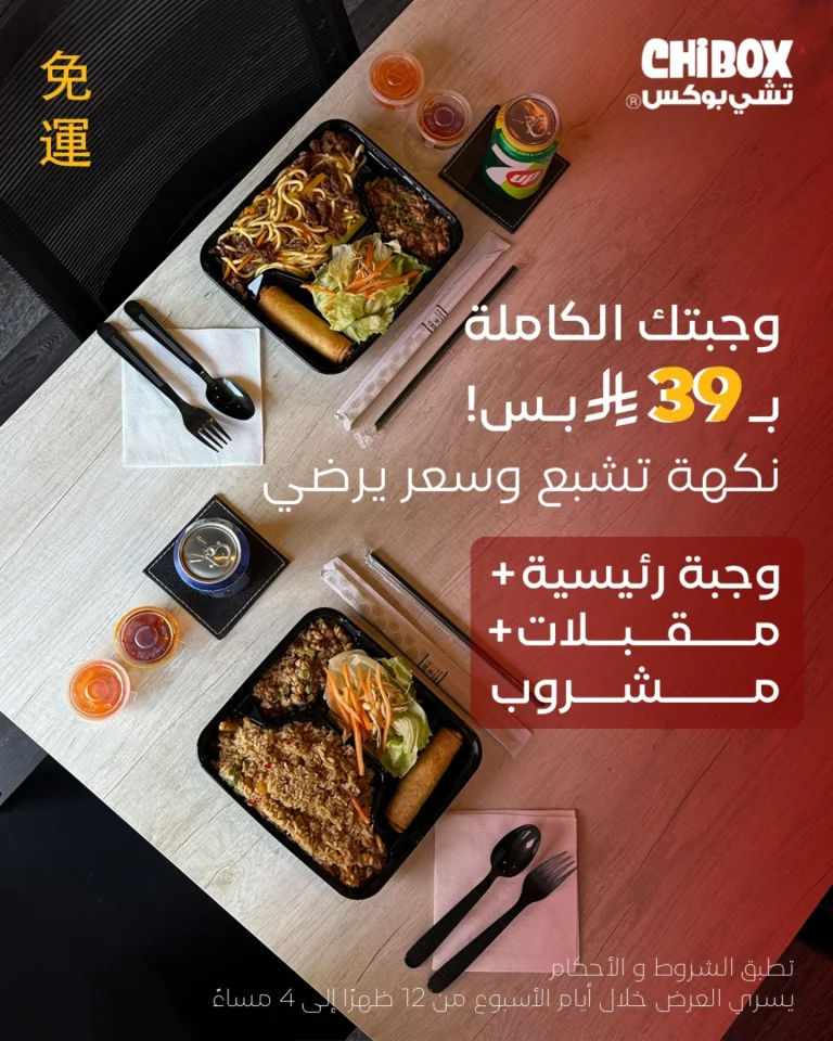 عروض مطعم تشي بوكس وجبتك الكاملة ب 39 ريال فقط يسري العرض طيلة ايام الاسبوع استمتع بأشهى الوجبات تبدأ من اليوم 20 اكتوبر 2025