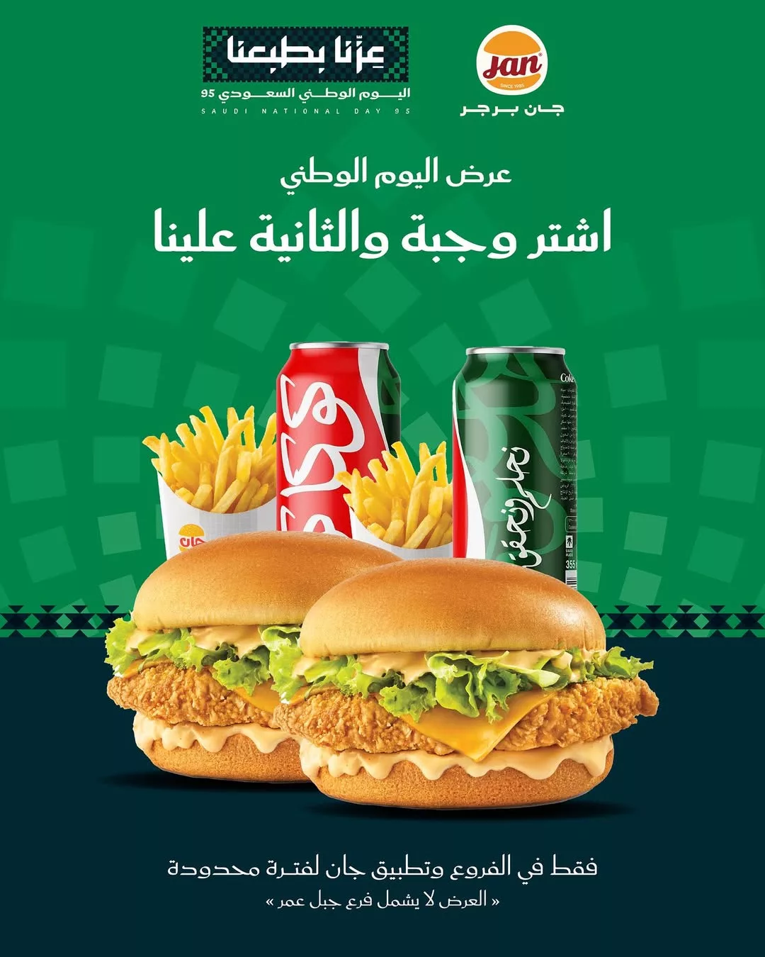 عروض مطعم جان برجر اشتري وجبة و الثانية علينا احتفالا في اليوم الوطني 2025 فقط في الفروع و تطبيق جان برجر ولفتره محدوده فقط العرض لا يشمل فرع جبل عمر .