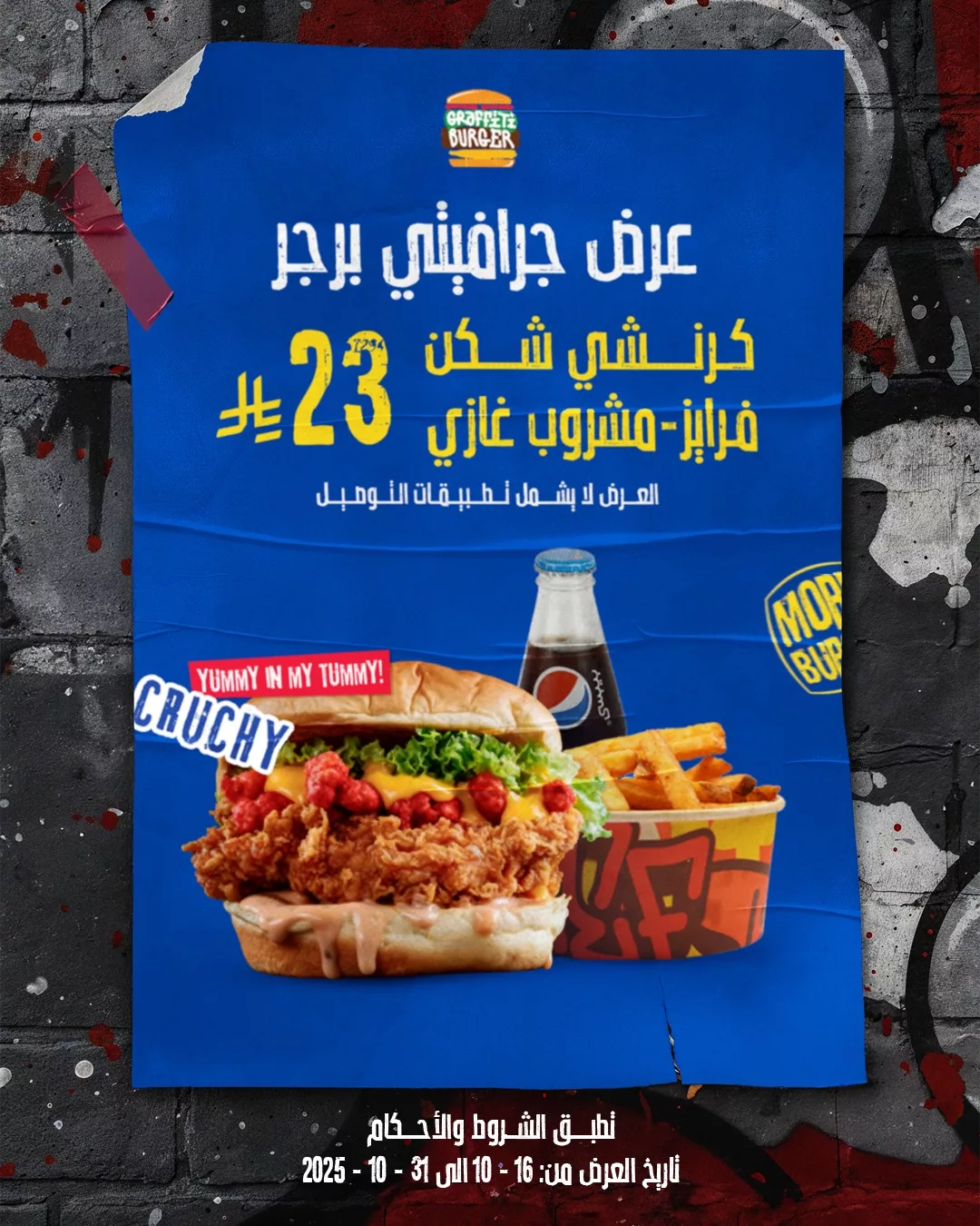 عروض مطعم جرافيتي برجر على كرنشي تشكن و بريوش حتى 31 اكتوبر 2025