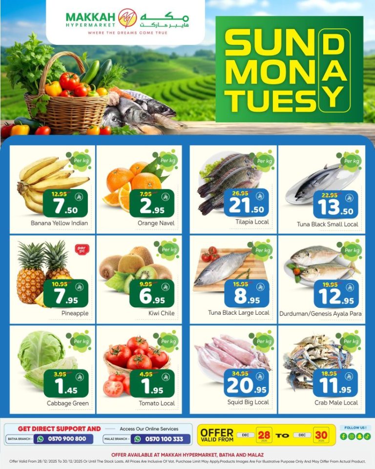 عروض مكة هايبر ماركت الاحد 28 ديسمبر 2025 و تحتوي علي تشكيلة من الخضروات و الفواكه الطازجة مثل البرتقال و و الموز و الاناناس و الطماطم بجانب ذلك بتوفر تشكيلة من الاسماك الشهية و اللحوم وغيرها من المنتجات في عرض حصري متاح لمدة 3 ايام فقط و باقل الاسعار تابعونا لمعرفة كل جديد