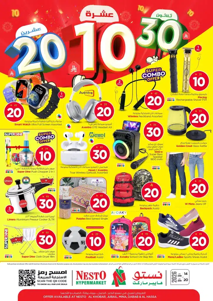 عروض نستو الأحساء الأربعاء 14 يناير 2026 الموافق 25-7-1447هـ و يضم جهاز صنع الكريب ومبرد هواء متنقل ومكنسة يدوية وفرن ميكروويف وسخان مياه ومكواة سفر ومكينة حلاقة وشاشة بلازما ثم تأتي المنتجات الغذائية لتشمل البطاطس والبصل والزيتون وزيت الزيتون والحليب المجفف والمخبوزات والحلويات الشرقية والدجاج