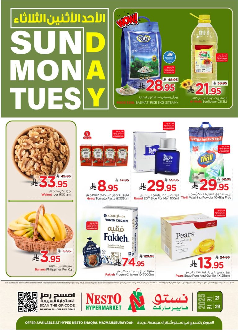 عروض نستو القصيم الاحد 21-12-2025 بتقدم ليكم أنواع متعددة من الأرز والزيوت والبقوليات إضافة إلى مساحيق الغسيل ومنتجات العناية المنزلية بجانب ايضا منتجات المخبوزات والحلويات والشكولاتة والمكسرات بأنواعها مع الأسماك واللحوم الطازجة والخضار والفاكهة في عرض حصري باقل الاسعار لمدة 3 ايام فقط