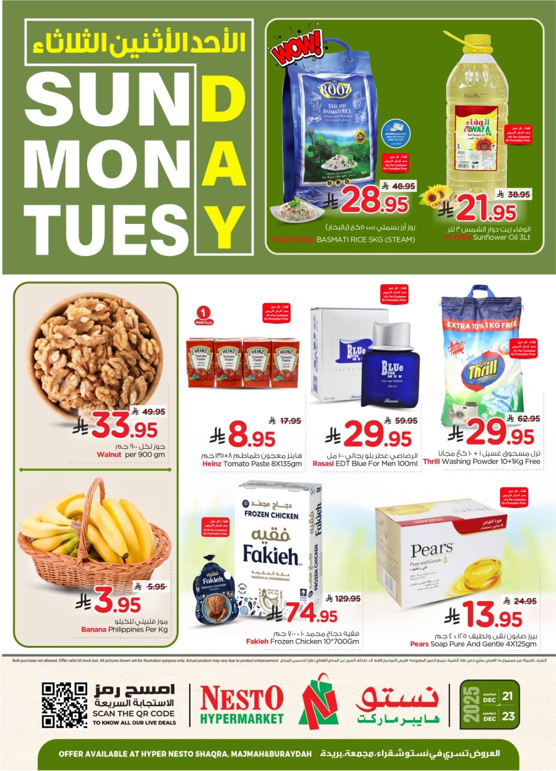 عروض نستو القصيم الاحد 21-12-2025 بتقدم ليكم أنواع متعددة من الأرز والزيوت والبقوليات إضافة إلى مساحيق الغسيل ومنتجات العناية المنزلية بجانب ايضا منتجات المخبوزات والحلويات والشكولاتة والمكسرات بأنواعها مع الأسماك واللحوم الطازجة والخضار والفاكهة في عرض حصري باقل الاسعار لمدة 3 ايام فقط