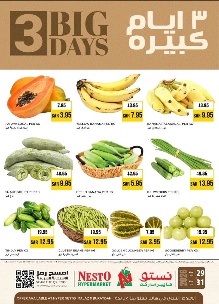 عروض نستو الملز الويكند الخميس 29-1-2026 الموافق 10 شعبان 1447هـ و تحتوي علي بابايا جيزان وموز أصفر وموز راسكادالي وقرع كايو وموز أخضر وأعواد خضروات وقرع هندي وفاصوليا عنقودية وخيار ذهبي وعنب الثعلب بالإضافة إلى أرز مسلوق بوني وأرز تايلاندي وغيرها من المنتجات باقل الاسعار المناسبة للجميع