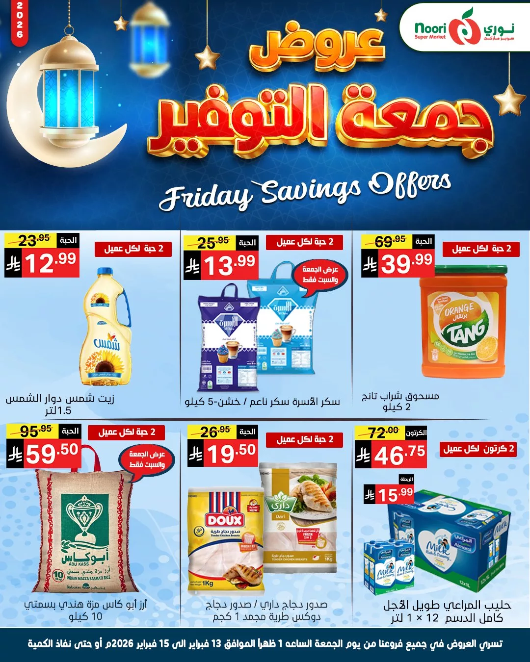 عروض نوري سوبر ماركت 13 فبراير 2026 لمدة 3 ايام الويكند تسري العروض من يوم الجمعة الساعة 01 ظهراً 13 فبراير الى يوم الأحد 15 فبراير2026م على مقاضي المنزل الاساسيه و تخفيضات رمضان المبارك لا تفوتوا عروض نهاية الاسبوع على الخضار و الفواكه و اللحوم و المواد الغذائيه بأفضل الاسعار
