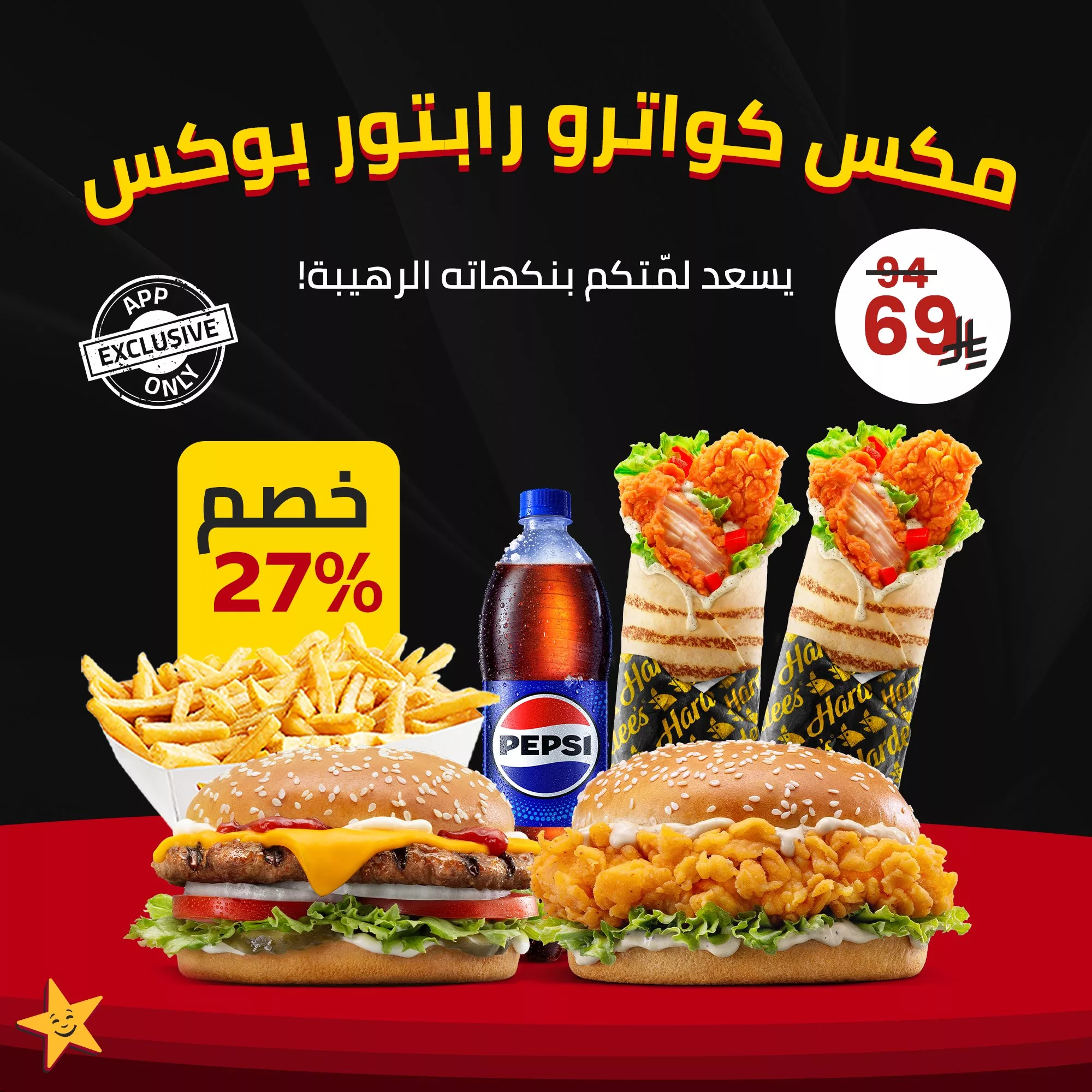 عروض هارديز السعودية خصم 27% على مكس كواترو رابتور بوكس الجمعة لها طعم مميز خصوصً…