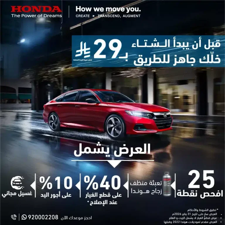 عروض هوندا السعودية اليوم تقدم افضل العروض المميزة علي خدمات السيارات المتنوعة منها تغير الزيوت و ايضا بتوفر خصومات خاصة علي قطع الغيار و اجور اليد و غيرها من الخدمات و التخفيضات و مستمرة حتي السبت 31 يناير 2026 – 12 شعبان 1447هـ ابقوا معنا علي موقعكم عروض توداي ليصلكم كل جديد