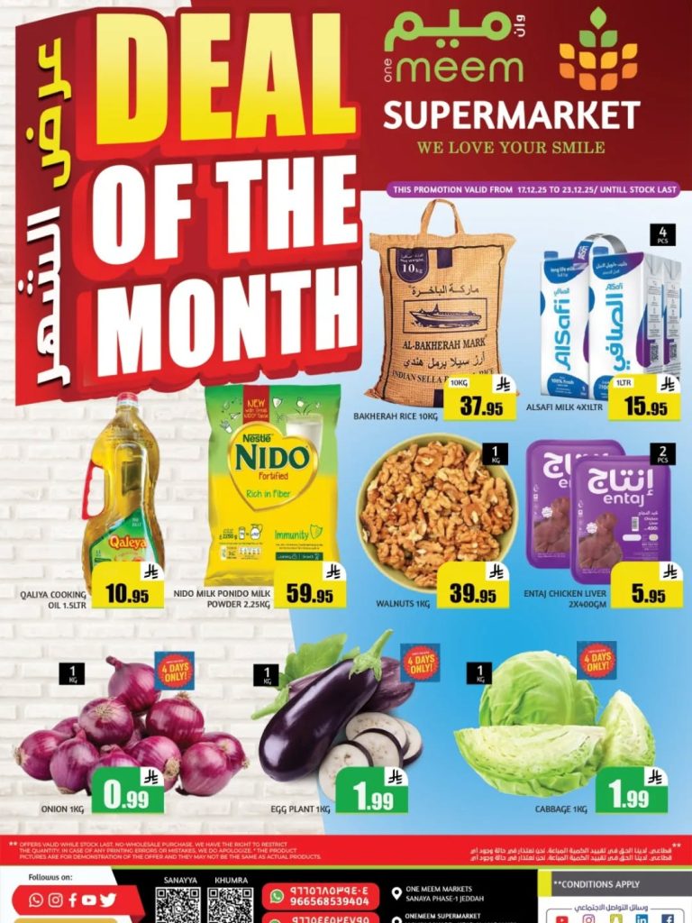 عروض وان ميم ماركت مستمرة حتي الثلاثاء 3 رجب 1447هـ و تحتوي علي تشمل الأرز والحليب والزيوت والمكسرات والدواجن والخضروات الطازجة و يتضمن كذلك تشكيلة من البقوليات والمعلبات والمكسرات والفواكه والخضروات مثل الطماطم والباذنجان والكرنب والموز والتفاح والفراولة إلى جانب العدس والبازلاء واللوز والفستق والتمور