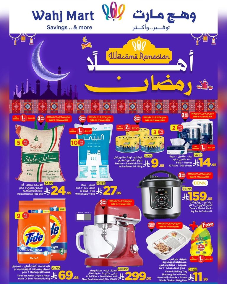 بنقدم ليكم احدث عروض وهج مارت الاسبوعية السبت 17-1-2026 الموافق 28 رجب 1447هـ و تحتوي علي تشكيلة من المنتجات الغذائية و الاستهلاكية منها السكر و الزيوت و الارز و بجانب تشكيلة من اللحوم الطازجة و الاسماك و كذلك البهارات و المعلبات و باسعار مميزة في عروض و تخفيضات رمضان ابقوا معنا ليصلكم كل جديد