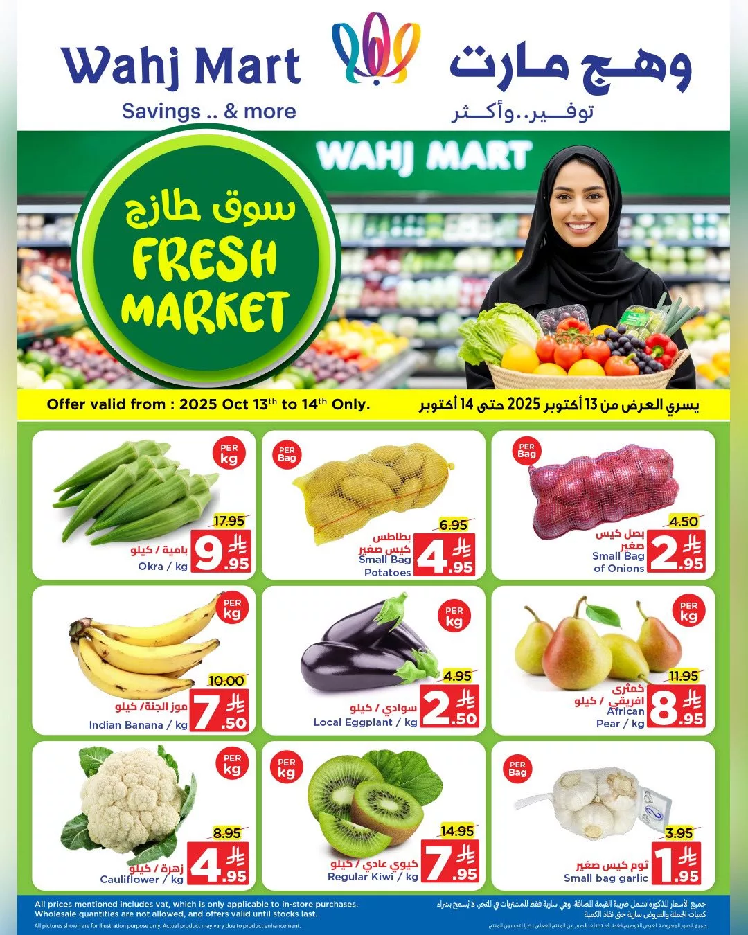 عروض وهج مارت جدة الاثنين 13 أكتوبر 2025 تقدم تشكيلة متنوعة من الخضار والفواكه الطازجة مثل البطاطس والبصل والباذنجان المحلي والموز الهندي والكمثرى الأفريقي بالإضافة إلى القرنبيط والكيوي والثوم و توفر أيضا اللحوم الطازجة مثل لحم العجل والعجل بدون عظم وكبدة العجل وخروف مشكل وستيك ريب