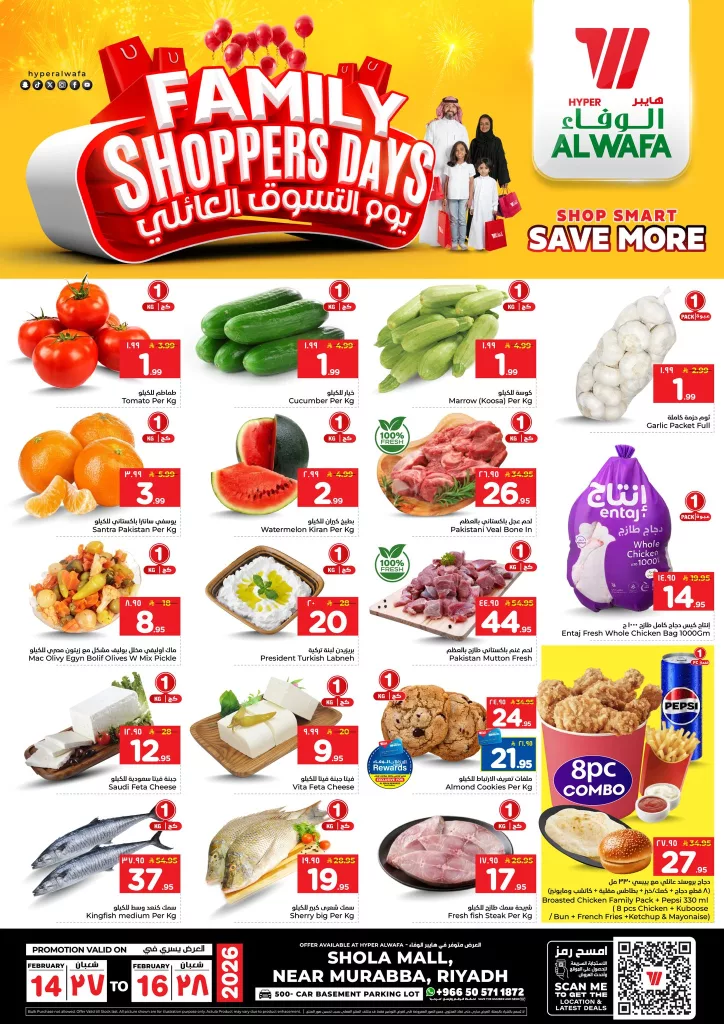 عروض الوفاء هايبر ماركت السبت 14-2-2026 الموافق 26 شعبان 1447 و تشمل علي تشكيلة متنوعة من المنتجات الطازجة كالفواكه والخضروات واللحوم والدجاج والأسماك بالإضافة إلى الألبان والأجبان والمجمدات والمكسرات والحلويات والتمور والبيض ووجبة عائلية متكاملة باسعار مميزة لفترة محدودة .