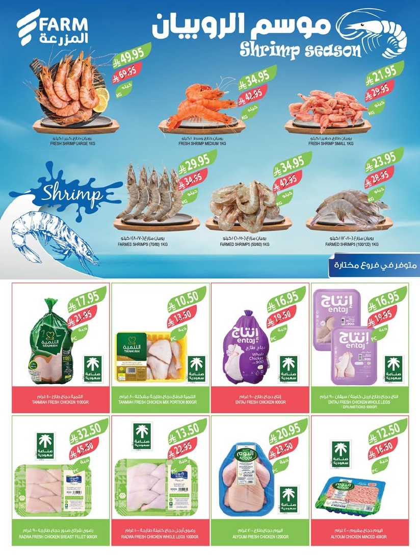 عروض أسواق المزرعة المنطقة الغربية الأسبوعية الأربعاء 26/2/1447هـ تقدم منتجات غذائية تشمل الأسماك البحرية الطازجة مثل السردين والهامور والروبيان بجانب المأكولات البحرية المجمدة والعصائر الطازجة المعبأة والفواكه الموسمية مثل البطيخ والكمثرى كما تضم الأجهزة المنزلية أجهزة تحضير الشاي وصانعات الكريب والمكانس