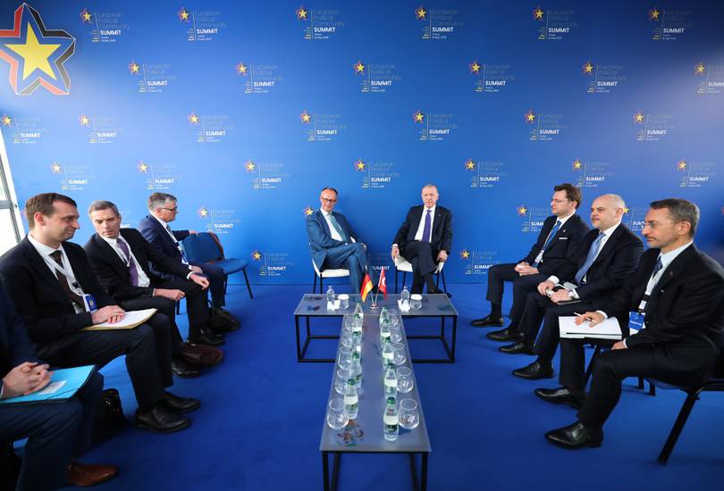 جانب من مباحثات إردوغان وميرتس على هامش قمة المجتمع السياسي الأوروبية في تيرانا في مايو الماضي (الرئاسة التركية)