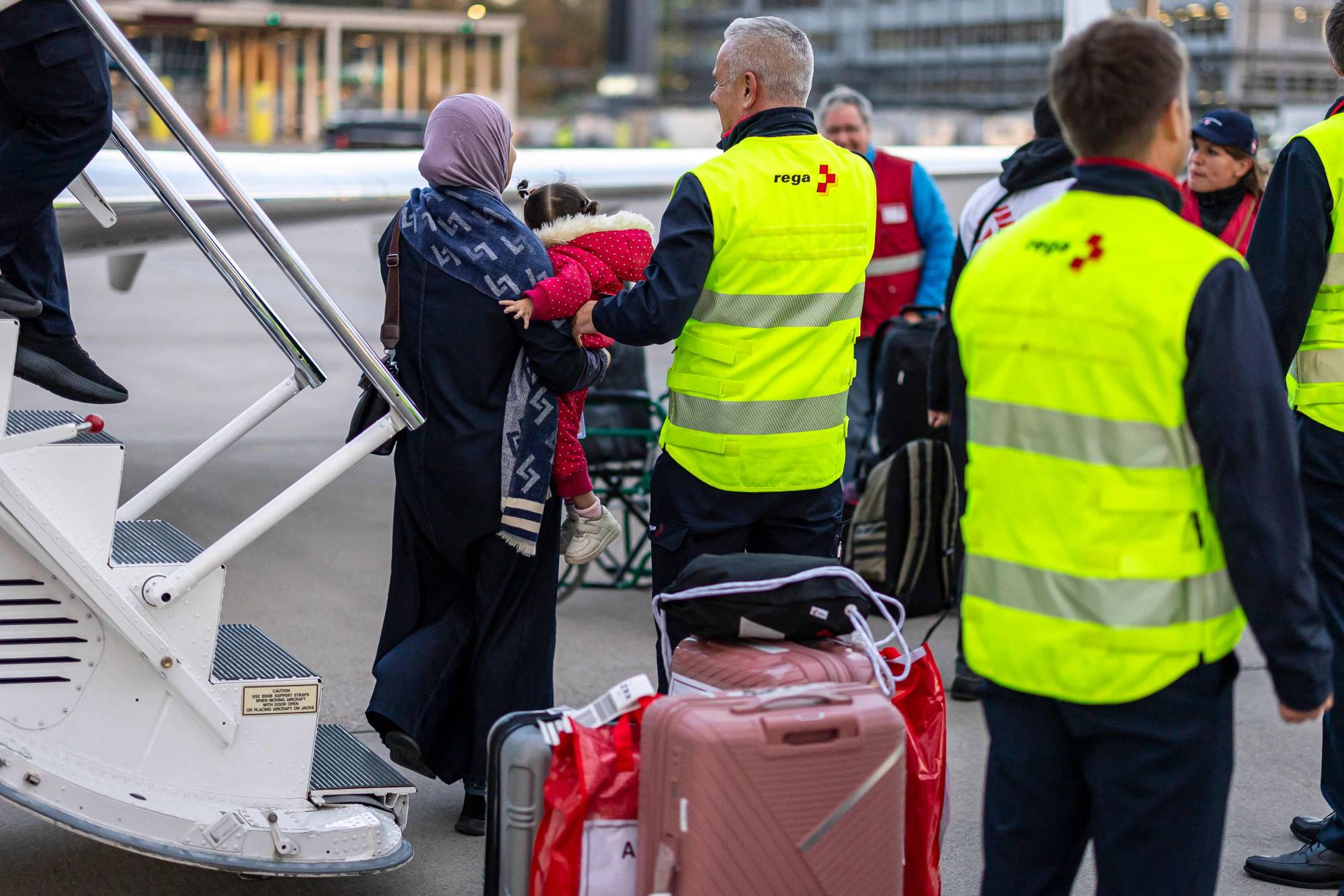 أطفال فلسطينيون جرحى من غزة وذووهم يصلون إلى مطار لوغانو في سويسرا على متن طائرة خاصة لتلقي العلاج (إ.ب.أ)