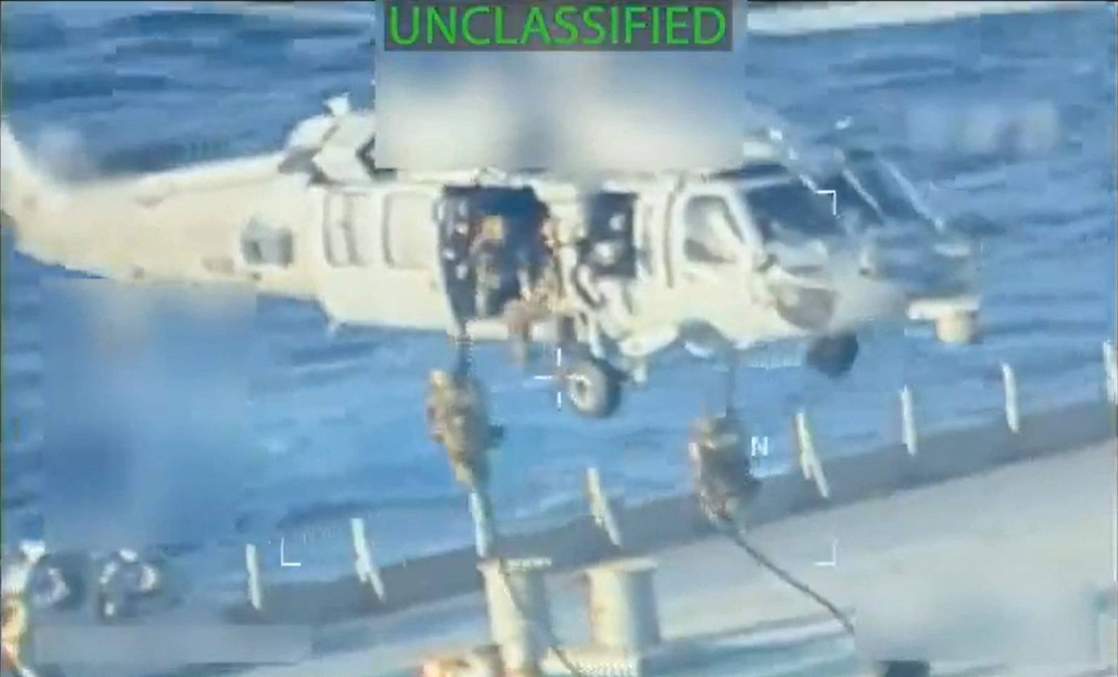 لقطة من فيديو نشرته وزيرة العدل الأميركية بام بوندي لتنفيذ أمر مصادرة ناقلة نفط خام تُستخدم لنقل النفط الخاضع للعقوبات من فنزويلا وإيران قبالة سواحل فنزويلا (أ.ف.ب)