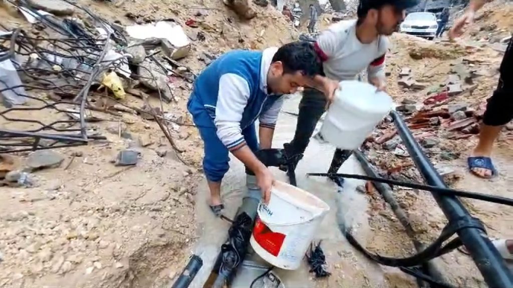 وسط قطع سلطات الاحتلال المياه عن قطاع غزة منذ 53 يوما عثر أهالي مخيم جباليا شمالي القطاع على خرطوم مياه أرضي كشفته حفرة أرضية خلّفها القصف الإسرائيلي.