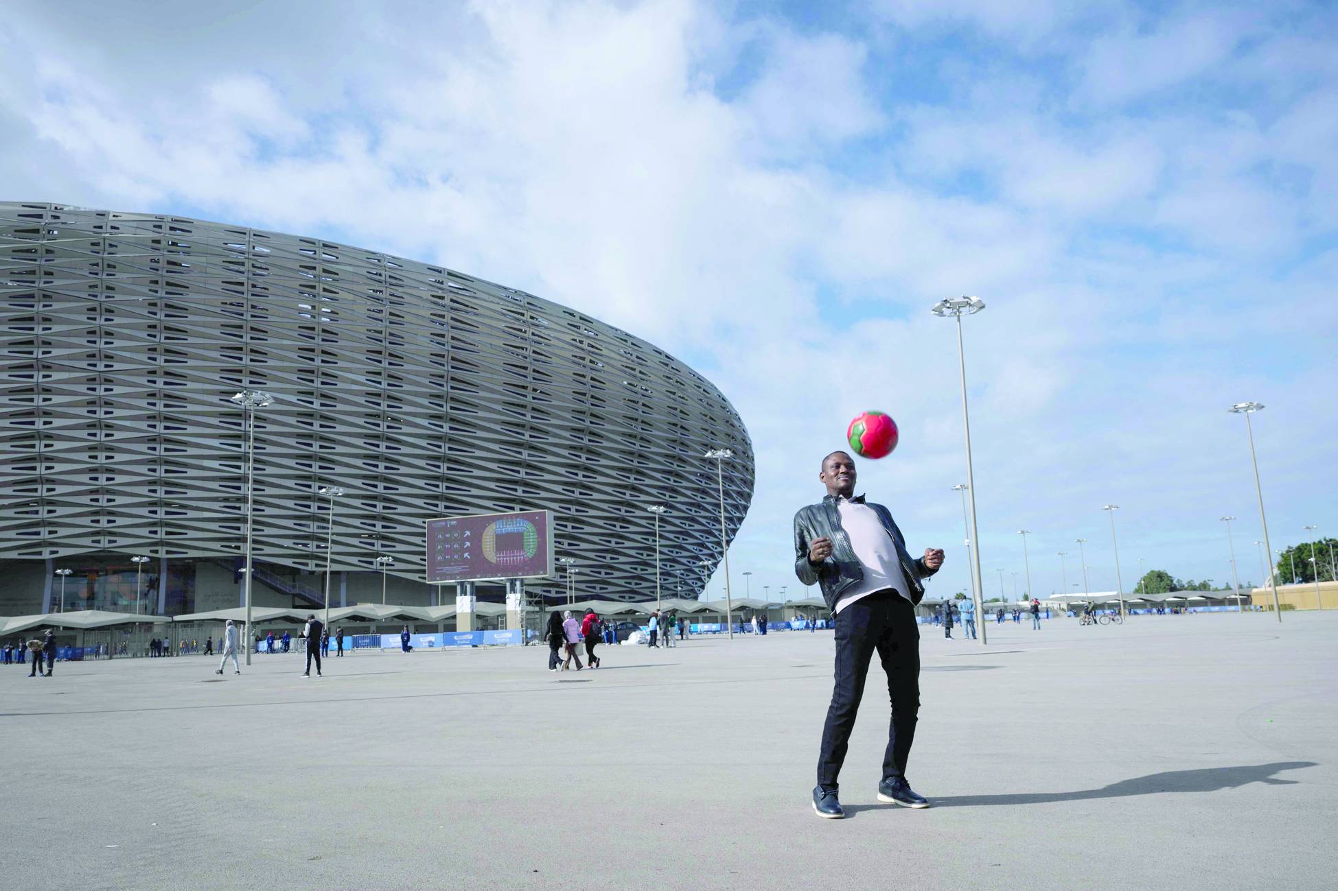 مراسل تلفزيوني يداعب الكرة أمام ملعب الأمير مولاي عبد الله حيث ستجرى مباراة الافتتاح (أ.ف.ب)