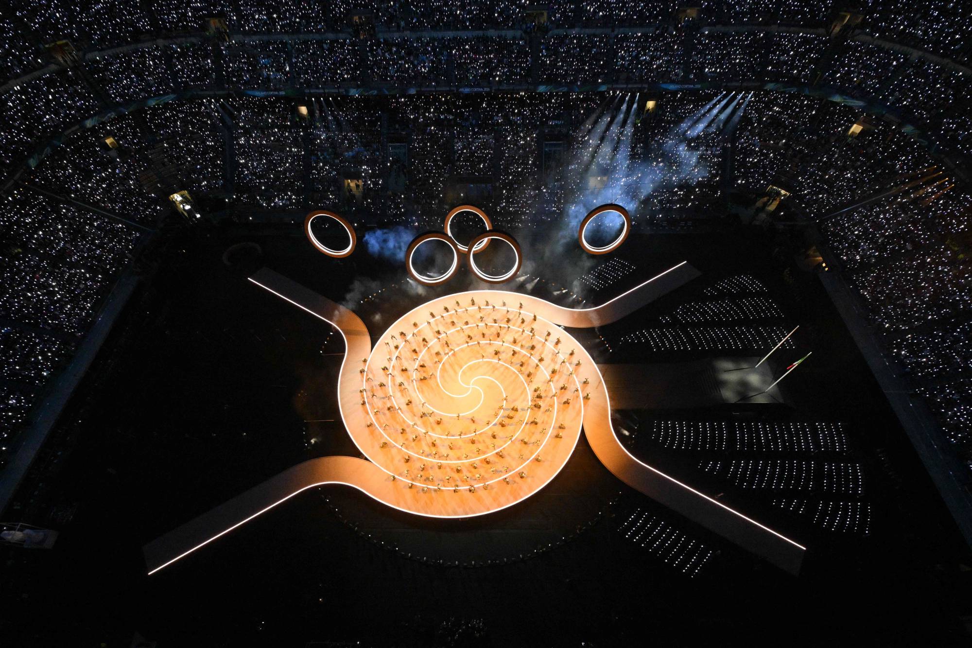 وعند الساعة 20:00 بالتوقيت المحلي، وفي أجواء معتدلة وسط مدينة ميلانو، رسم عشرات الفنانين شكلاً حلزونياً تتفرّع منه 4 أذرع، في إشارة رمزية إلى الامتداد نحو الساحات الثانوية المتمركزة وسط الثلوج على بُعد مئات الكيلومترات من عاصمة لومبارديا. وتُعد هذه الدورة الأكثر تشتّتاً من حيث مواقع المنافسات في تاريخ الألعاب الأولمبية الشتوية.